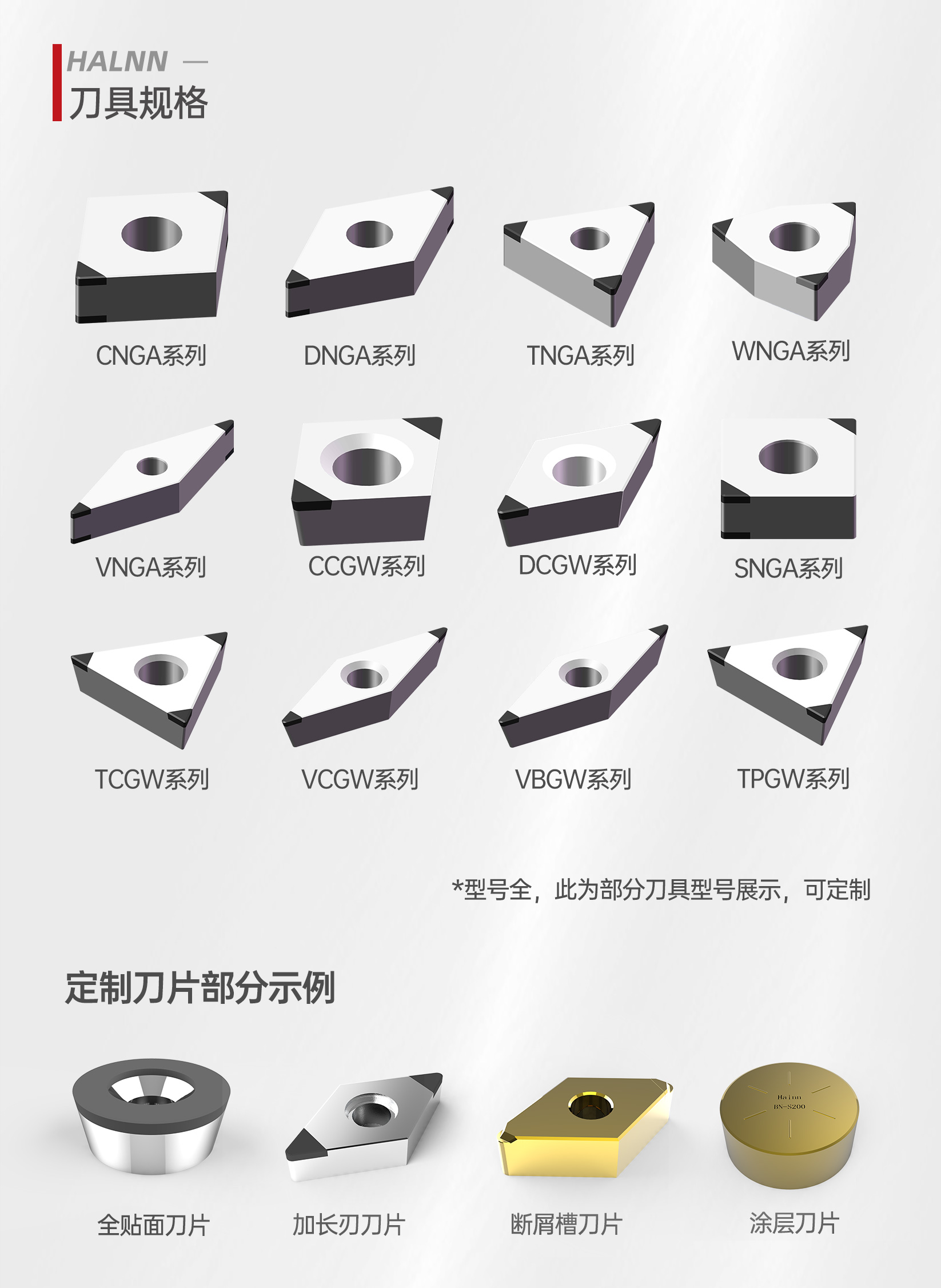 華菱超硬提供了多種硬車削CBN刀具規(guī)格,包括CNGA系列、VNGA系列、TCGW系列等,以滿足不同客戶的需求。此外,公司還提供定制刀片服務(wù),包括全貼面刀片、加長(zhǎng)刃刀片、斷屑槽刀片和涂層刀片等,以適應(yīng)各種復(fù)雜的加工環(huán)境。