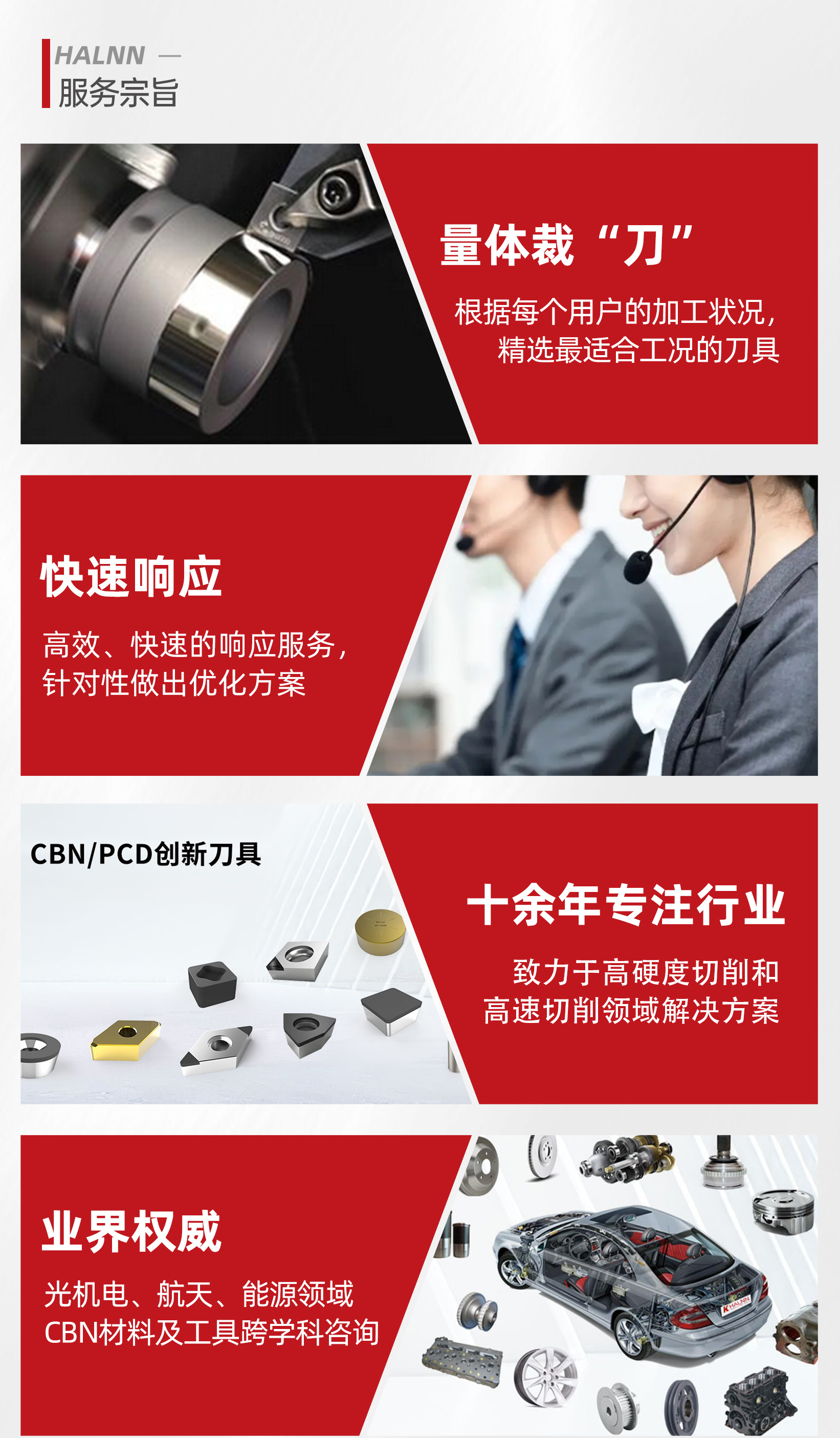華菱超硬堅(jiān)持“量體裁‘刀’”的服務(wù)宗旨,根據(jù)每個(gè)用戶的硬車削淬火鋼加工狀況,精選最適合工況的硬車削CBN刀具。公司提供快速響應(yīng)服務(wù),高效、快速地響應(yīng)客戶需求,針對(duì)性地做出優(yōu)化方案。