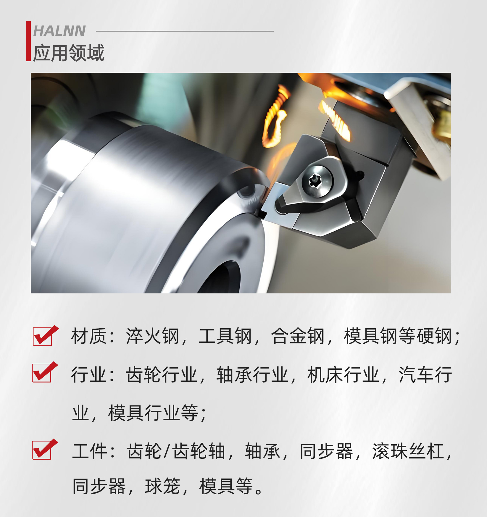 BN-H05系列CBN刀具廣泛應用于淬火鋼、工具鋼、合金鋼、模具鋼等硬鋼材質的加工,服務于齒輪、軸承、機床、汽車、模具等多個行業(yè)。