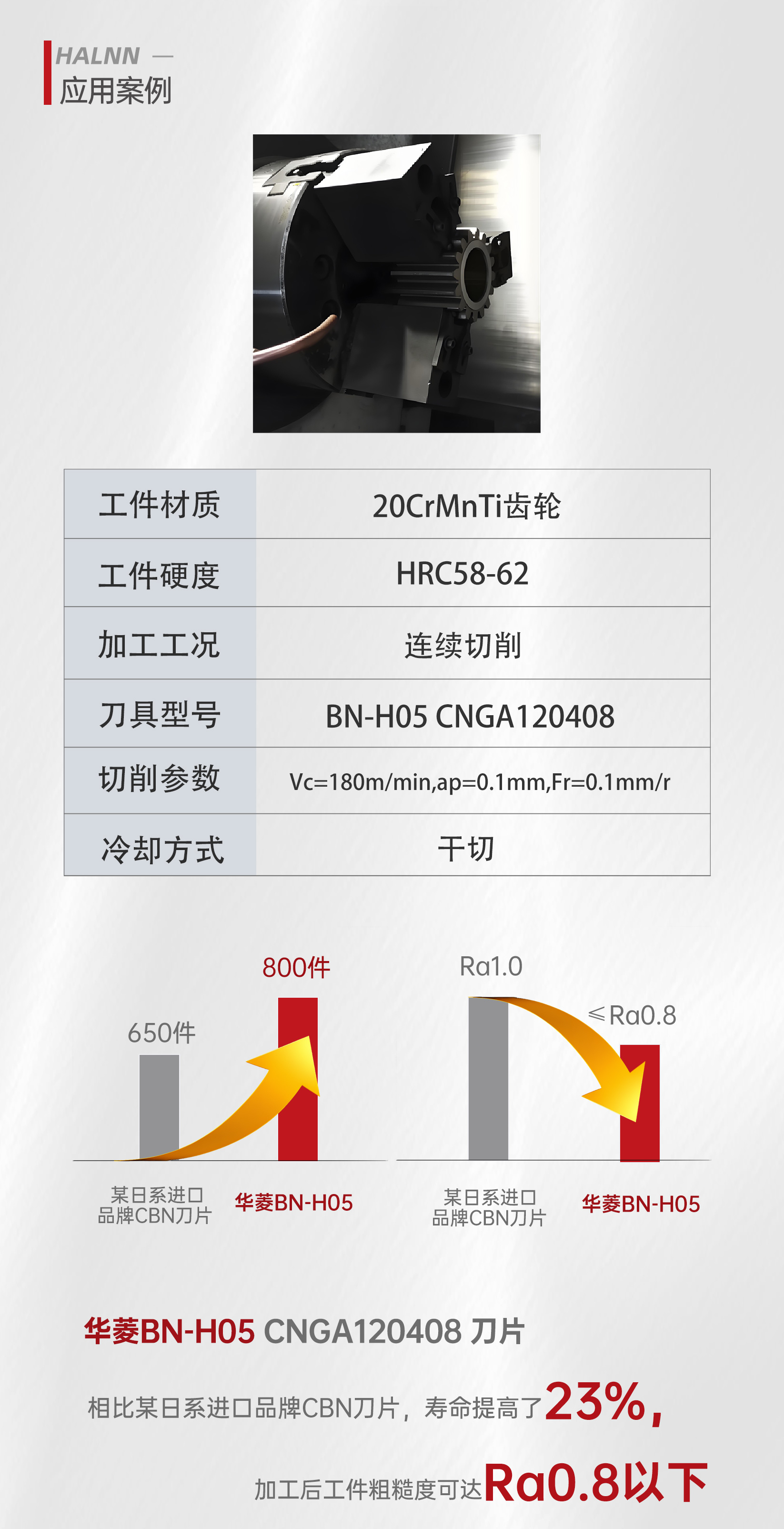 以20CrMnTi齒輪的連續(xù)切削為例,BN-H05系列CNGA120408刀具在HRC58-62的硬度下,展現了其卓越的性能。與某日系進口品牌CBN刀片相比,華菱BN-H05系列刀片的使用壽命提高了23%,加工后的工件粗糙度更是達到了Ra0.8以下。